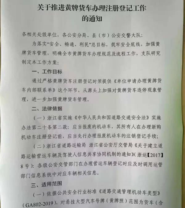 ● 浙江:黄牌车上牌要满足3个硬条件近日,浙江“黄牌货车办理登记注册”出台新要求,从文件内容来看,如果购车单位不满足以下几个条件,货车一律不准上牌。